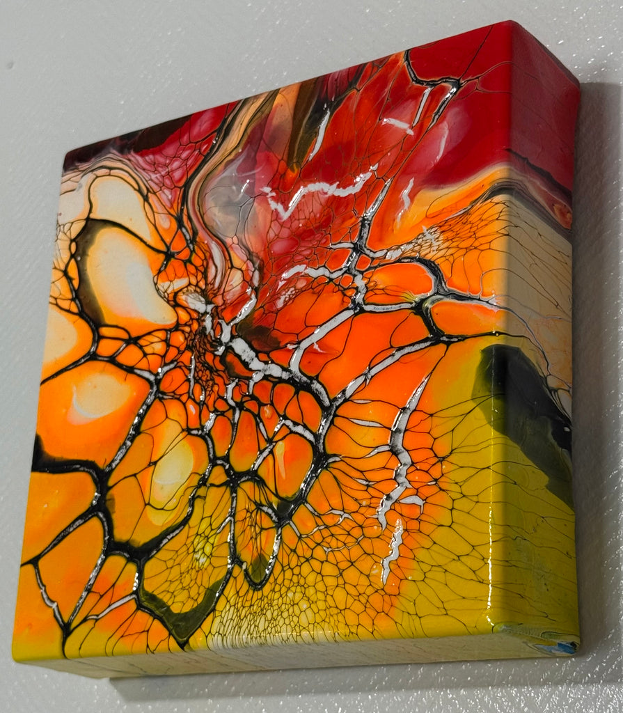 This 6×6-inch abstract acrylic painting bursts with radiant color and texture, created using the bloom technique. Bold hues of red, orange, and yellow flow together in organic motion, forming intricate cellular patterns that resemble the energy and light of a solar flare. Delicate black web-like lines weave through the composition, adding depth and contrast against the glowing background.