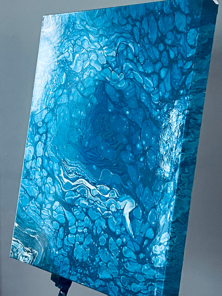 Immerse yourself in calming ocean-depth blues with this 20 x 24 in (50.8 x 60.96 cm) original abstract fluid art painting, created using the acrylic ring pouring technique. Multiple shades of deep sea blue, aqua, and shoreline-inspired tones flow together to form a mesmerizing, cell-rich pattern reminiscent of underwater currents and shifting tides.
